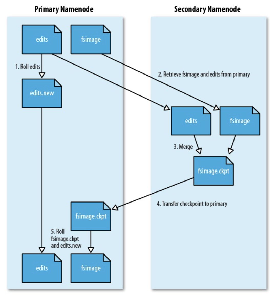 - 一旦内存中管理文件系统元数据的映射,则会创建一个新的 FSImage 文件和一个空白的 EditLog 文件。