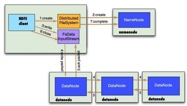 FSDataOutputStream对象,开始向 DataNode 写入数据,数据首先被写入FSDataOutputStream对象内部的数据队列中,数据队列由DataStreamer使用,它通过选择合适的 DataNode 列表来存储副本,从而要求 NameNode 分配新的 block; DataStreamer将数据包以流式传输的方式传输到分配的第一个 DataNode 中,该数据流将数据包存储到第一个 DataNode 中并将其转发到第二个 DataNode 中,接着第二个 DataNode 节点会将数据包转发到第三个 DataNode 节点;- DataNode 确认数据传输完成,最后由第一个 DataNode 通知 client 数据写入成功;