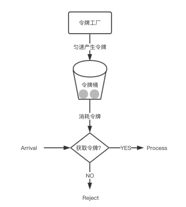放令牌这个动作是持续不断的进行,如果桶中令牌数达到上限,就丢弃令牌,所以就存在这种情况,桶中一直有大量的可用令牌,这时进来的请求就可以直接拿到令牌执行,比如设置 qps 为 100 ,那么限流器初始化完成一秒后,桶中就已经有 100 个令牌了,这时服务还没完全启动好,等启动完成对外提供服务时,该限流器可以抵挡瞬时的 100 个请求。所以,只有桶中没有令牌时,请求才会进行等待,最后相当于以一定的速率执行。