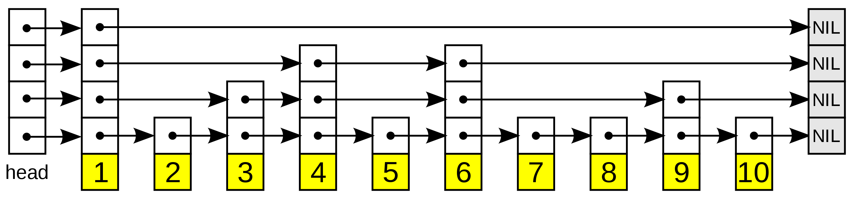 因为跳跃列表中的元素可以在多个列表中,所以每个元素可以有多于一个指针。跳跃列表的插入和删除的实现与普通的链表操作类似,但高层元素必须在进行多个链表中进行插入或删除。