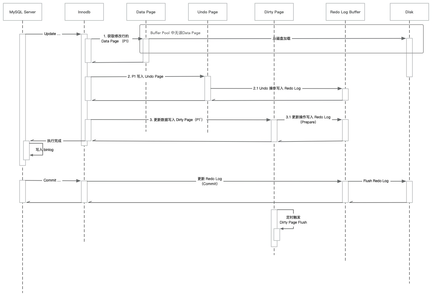 - 更新 P1 为 P1’ ,并将 P1’ 写入 Dirty Page ,记录变更到 Redo Log Buffer(Prepare 状态)