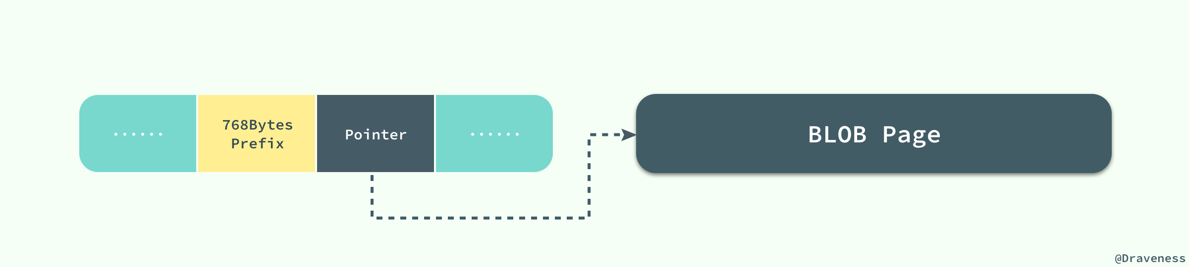 通常我们认为 blob 这类的大对象的存储会把数据存放在 off-page,其实不然,关键点还是要看一个 page 中到底能否存放两行数据,blob 可以完全存放在数据页中(单行长度没有超过 8kb),而 varchar 类型的也有可能存放在溢出页中(单行长度超过 8kb,前 768byte 存放在数据页中)。