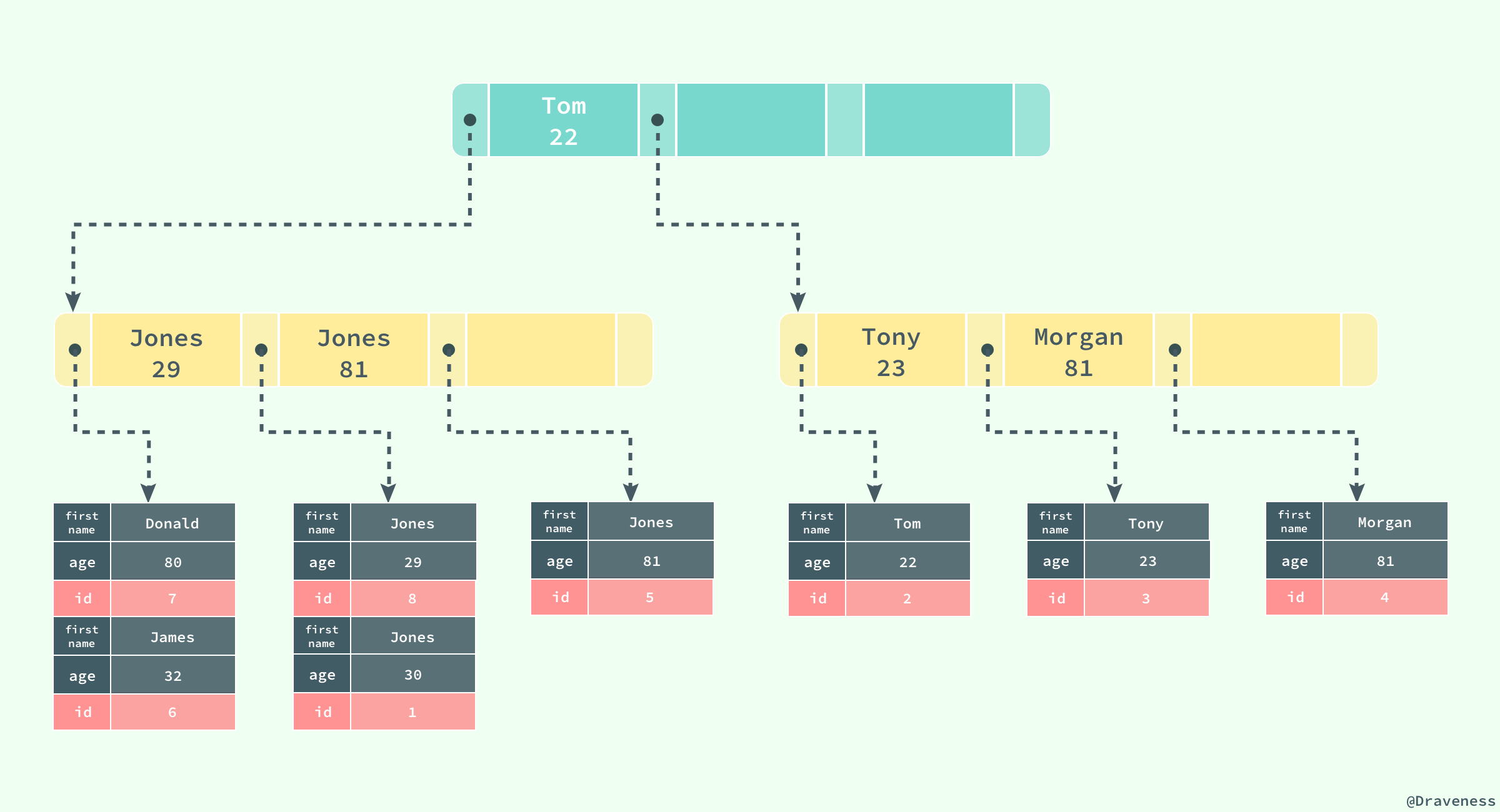 如果在表 users 中存在一个辅助索引 (first_name, age),那么它构成的 B+ 树大致就是上图这样,按照 (first_name, age) 的字母顺序对表中的数据进行排序,当查找到主键时,再通过聚集索引获取到整条行记录。