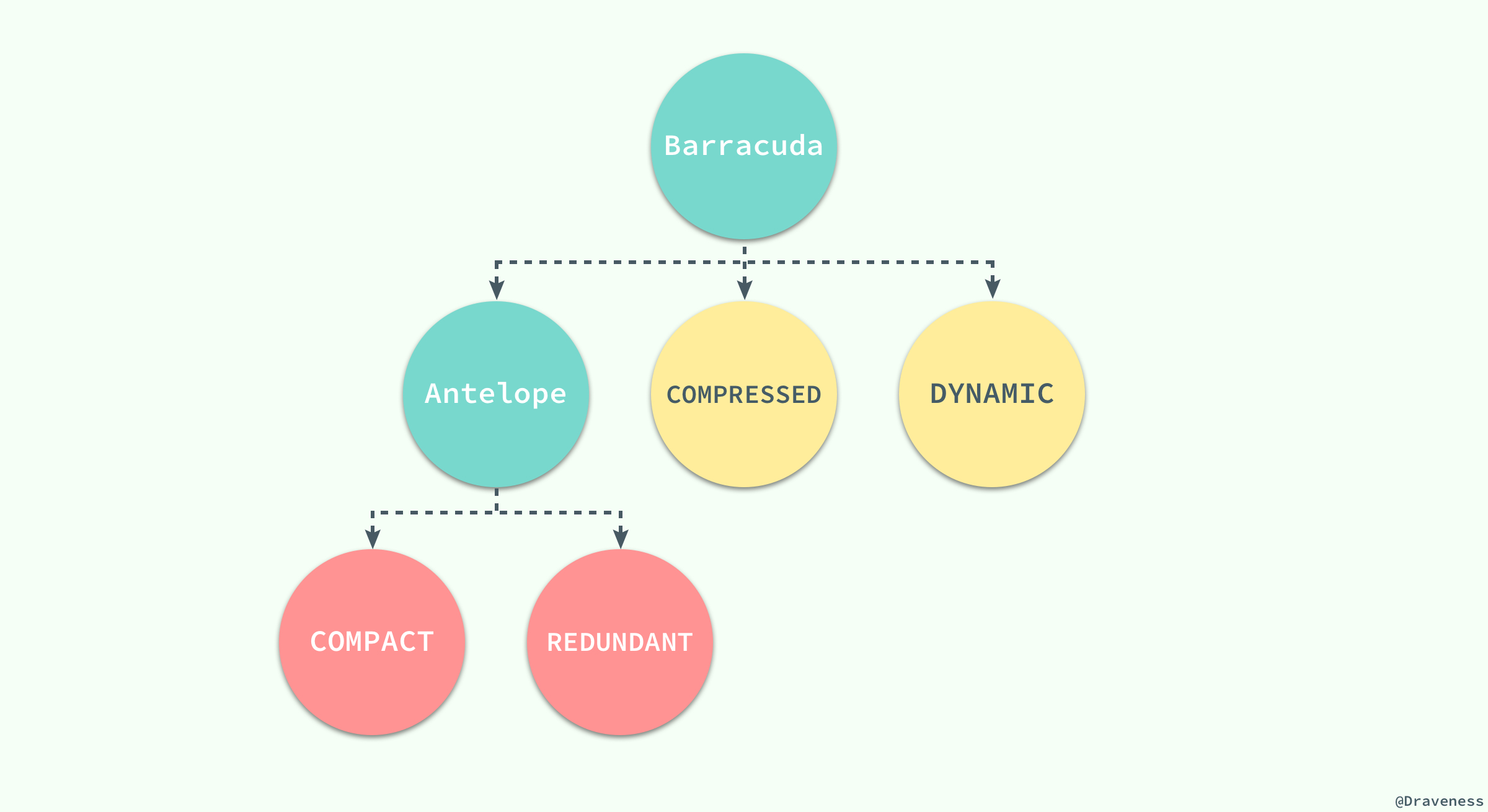 Antelope是 InnoDB 最开始支持的文件格式,它包含两种行格式Compact和Redundant,它最开始并没有名字;Antelope的名字是在新的文件格式Barracuda出现后才起的,Barracuda的出现引入了两种新的行格式Compressed和Dynamic;InnoDB 对于文件格式都会向前兼容,而官方文档中也对之后会出现的新文件格式预先定义好了名字:Cheetah、Dragon、Elk 等等。