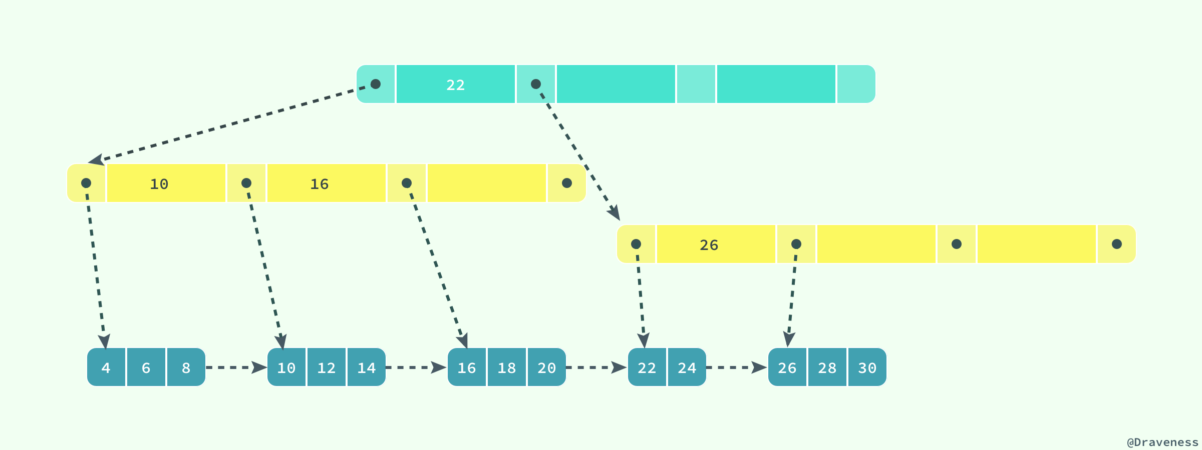 这里我们先假设 B+ 树高为2,即存在一个根节点和若干个叶子节点,那么这棵 B+ 树的存放总记录数为:根节点指针数*单个叶子节点记录行数。这里假设一行记录的大小为1k,那么一个页上的能放 16 行数据。假设主键ID为 bigint 类型,长度为 8 字节,而指针大小在 InnoDB 源码中设置为 6 字节,这样一共14字节,那么可以算出一棵高度为 2 的 B+ 树,能存放 \(16 \times 1024\div 14\times 16=18720\) 条这样的数据记录。