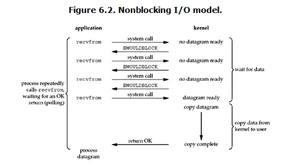 当用户进程发出 read 操作时,如果 kernel 中的数据还没有准备好,那么它并不会 block 用户进程,而是立刻返回一个 error 。从用户进程角度讲 ,它发起一个 read 操作后,并不需要等待,而是马上就得到了一个结果。用户进程判断结果是一个 error 时,它就知道数据还没有准备好,于是它可以再次发送 read 操作。一旦 kernel 中的数据准备好了,并且又再次收到了用户进程的 system call ,那么它马上就将数据拷贝到了用户内存,然后返回。