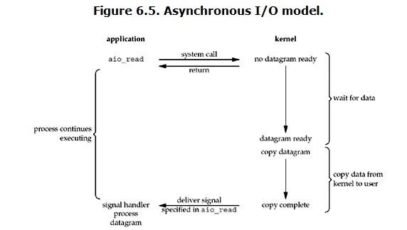 用户进程发起 read 操作之后,立刻就可以开始去做其它的事。而另一方面,从 kernel 的角度,当它受到一个 asynchronous read 之后,首先它会立刻返回,所以不会对用户进程产生任何 block 。然后,kernel 会等待数据准备完成,然后将数据拷贝到用户内存,当这一切都完成之后,kernel 会给用户进程发送一个 signal ,告诉它 read 操作完成了。
