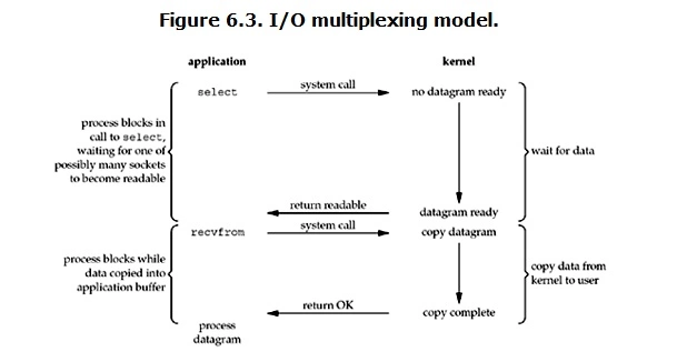 这个图和 blocking IO 的图其实并没有太大的不同,事实上,还更差一些。因为这里需要使用两个 system call (select 和 recvfrom),而 blocking IO 只调用了一个 system call (recvfrom)。但是,用 select 的优势在于它可以同时处理多个 connection 。