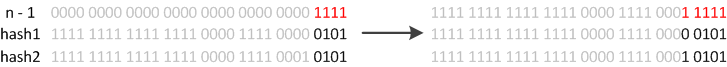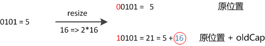 因此元素在重新计算 hash 之后,因为n变为2倍,那么 n-1 的 mask 范围在高位多1bit(红色),因此新的index就会发生这样的变化: