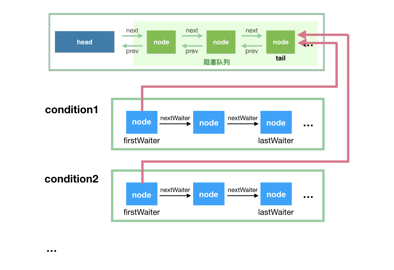 - 条件队列和等待队列的节点,都是 Node 的实例,因为条件队列的节点是需要转移到等待队列中去的;