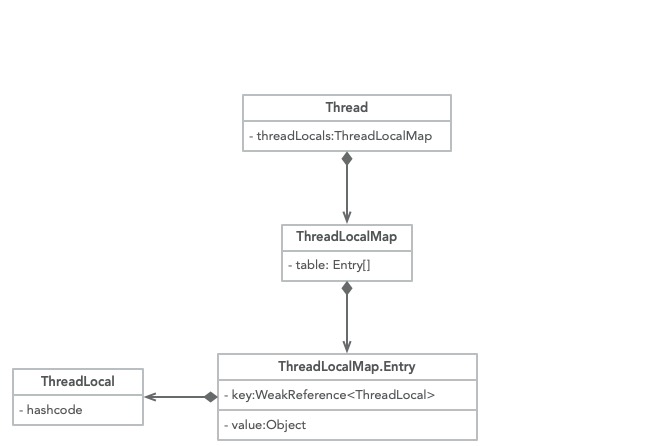 每个线程中都保有一个ThreadLocalMap的成员变量,ThreadLocalMap 内部采用WeakReference数组保存,数组的key即为ThreadLocal 内部的Hash值。