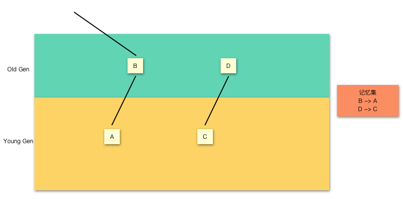这个时候要进行 Young GC,要确定 C 是否被堆外引用,就需要遍历 Old Gen,这样的代价太大。所以 JVM 在进行对象引用的时候,会有个 记忆集(Remembered Set) 记录从 Old Gen 到 Young Gen 的引用关系,并把记忆集里的 Old Gen 作为 GC Root 来构建引用图。这样在进行 Young GC 时就不需要遍历 Old Gen。